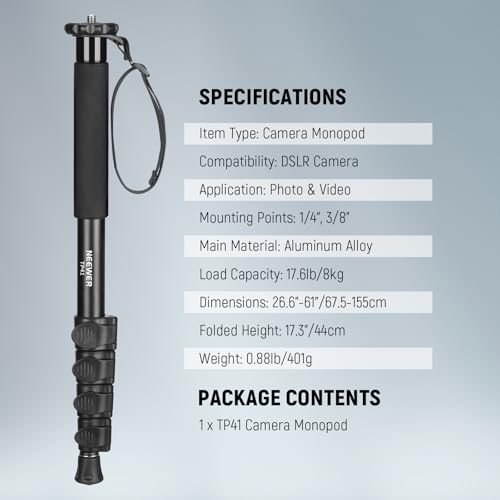 NEEWER 61"/155cm Camera Monopod Stand, Aluminum Alloy Portable Travel Video Monopod Pole with 1/4" 3/8" Screw Adapter for DSLRs Camcorder, Professional Photography Accessories, Max Load 17.6lb, TP41, Black